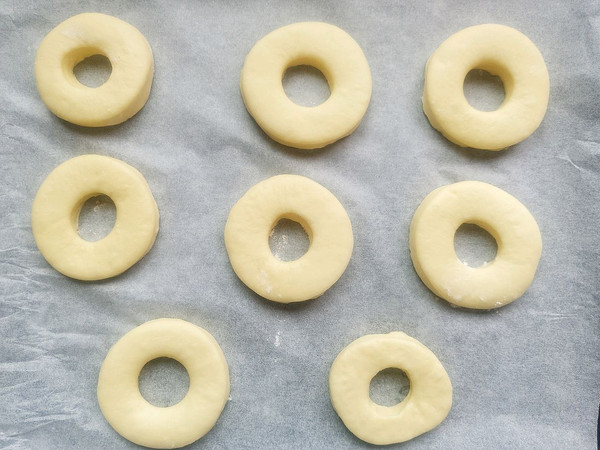 准备一个盘子,盘子内垫上一张防粘油纸,把做好的甜甜圈生胚放在油纸上,放的时候,距离要隔开一些,因为发酵的时候会膨胀,容易粘在一起