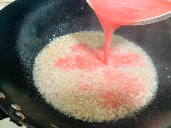 红葱头切碎备用;西红柿切块用料理机打汁过滤备用(西红柿的籽不要哦)