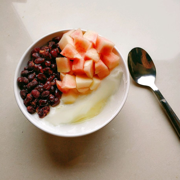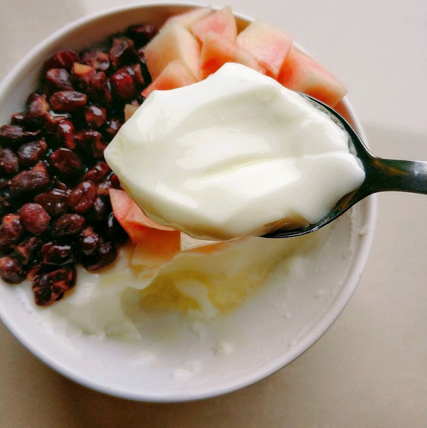 加入自己喜欢的水果或者豆子就大功告成了,个人觉得加豆子,芒果,桃子,草莓果肉酱会好吃。