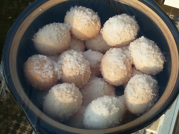 秋冬季,天气凉,慢慢腌制的咸蛋会更好吃些,天气暖和的时候,我还把它们拿到阳台晒晒太阳。