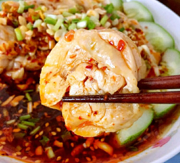 冷藏好的鸡肉撒上花生碎,淋上调味汁,再撒上些葱花即可