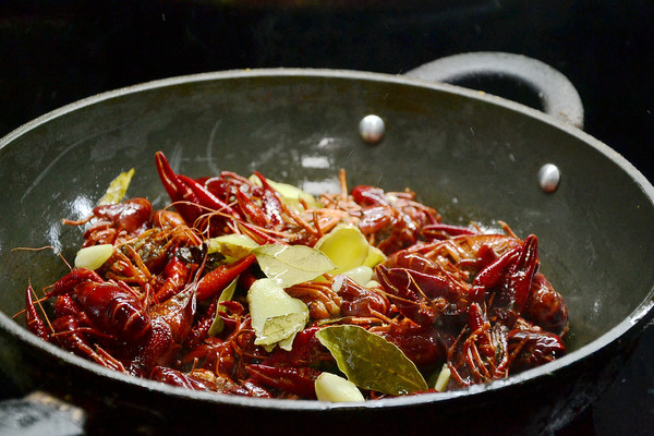 然后加入生抽料酒和少许的老抽,胡椒粉,糖以及刚没到小龙虾的水,盖上盖子煮开,接着焖煮20分钟左右使其完全入味,最后起锅之前撒上蒜蓉,根据自己口味放点盐十三香和胡椒粉就可以了。