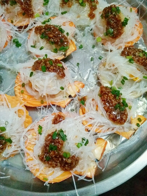 将扇贝壳摆放整齐,先底层放豆粉丝,再放扇贝肉,最上层再放豆粉丝,然后淋入第二步骤制作好的蒜蓉酱,撒上葱花