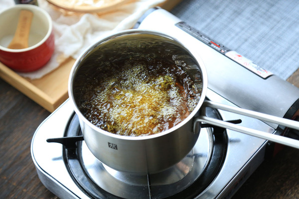中火炸至金黄色(约10分钟),捞出控油,并清理一下油渣;