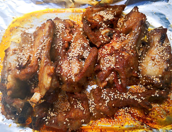 把烤盘中的汁水倒掉,重新换一张干净锡纸,把烤羊排放入烤盘,再撒入孜然粉,辣椒粉,并用刷子在羊排上刷一层橄榄油,把孜然粉辣椒粉重新刷匀。