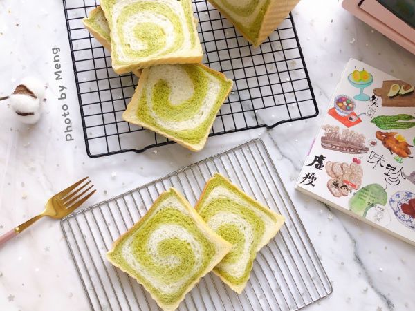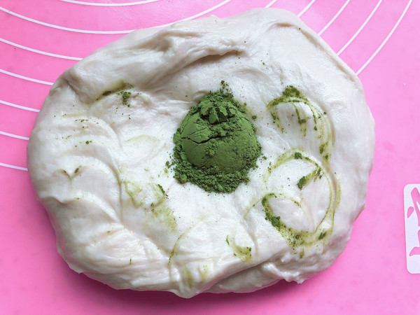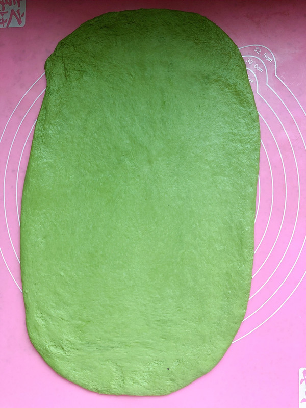 抹茶放在原色上 原色比抹茶色略微大一圈。尽量擀长一些,卷出来纹路好看
