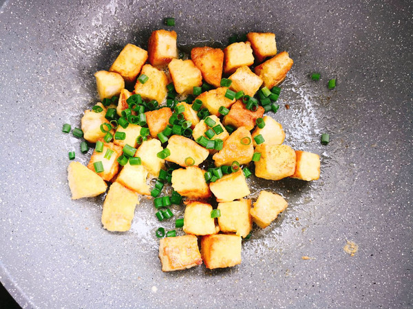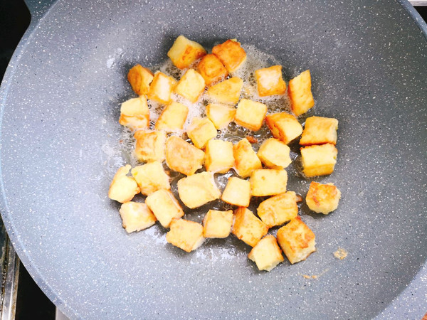 锅中倒入适量油烧至五成热,倒入馒头丁。
