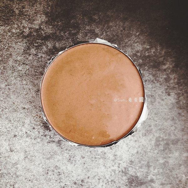 倒入剩下的慕斯液,震出气泡,冰箱冷藏6小时以上脱模,表面撒一层可可粉即可