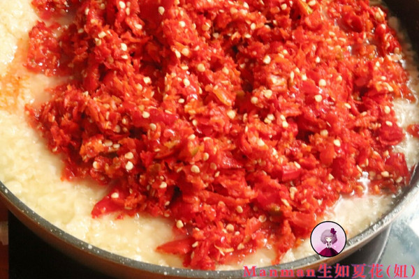 然后倒入蒜末,油刚好没过蒜末就行了,冷油放入蒜末主要是怕蒜末炒糊了,个人习惯问题。油热与不热随意。