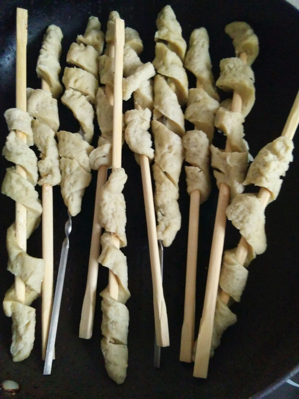用签或一次性筷子把面筋插上后用刀从一头螺旋式的切开后适当拉开。