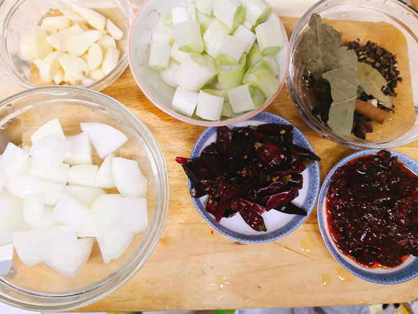 大葱只要葱白,切成小段,长度超不多1-1.5CM。洋葱切成比不多一样大。蒜瓣切开,别切太薄,一破二就好。干辣椒拿水泡下,泡2分钟就行,主要怕炒焦了,切小段。郫县豆瓣拿刀切切碎。
