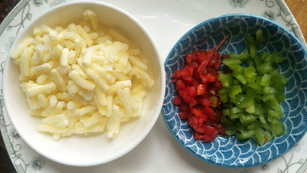 取出芝士对放室温解冻,青椒红椒切小丁备用。
