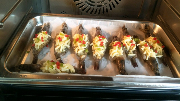 烤盘垫上油纸,摆上虾,把炒好的蒜蓉铺在虾上。