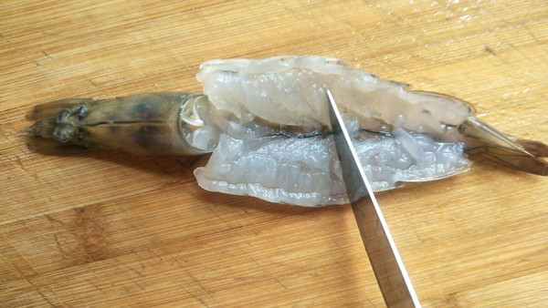 用剪刀剪去虾枪虾脚,去掉虾线。