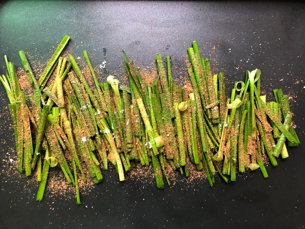 韭菜均匀铺在烤盘上,辣椒面、五香粉、白胡椒粉、盐均匀的撒在韭菜上;