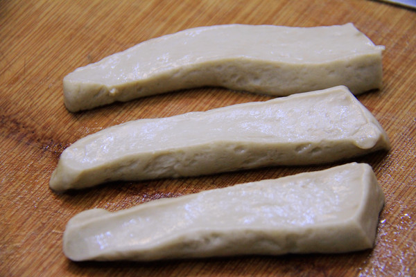 再用刀转着斜切,将面筋切成串,并适当调整松动一些。