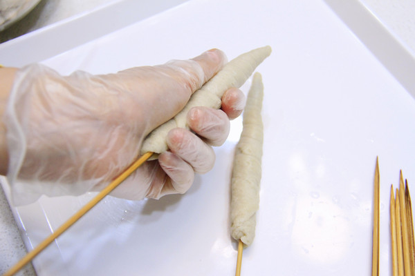 取一块小面团,先用2根筷子夹住面团的一头,转动筷子边拉伸开面团,将面团均匀的缠绕在筷子上,拉紧一些,缠上后就会粘在一起了,最后从筷子上取下来即可。