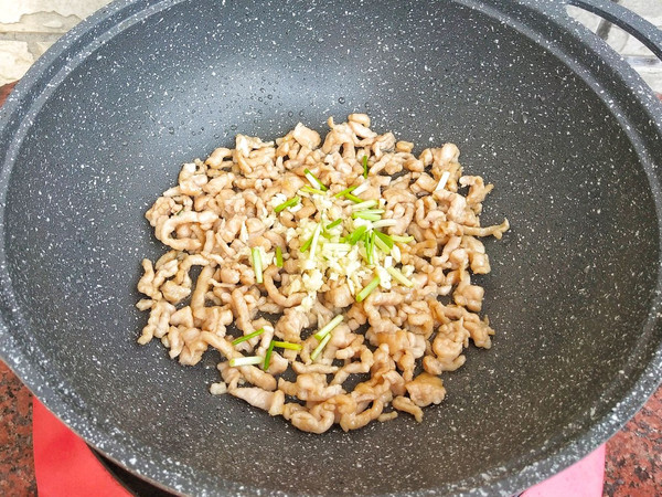 热锅温油,下腌制过的猪瘦肉滑炒至变色