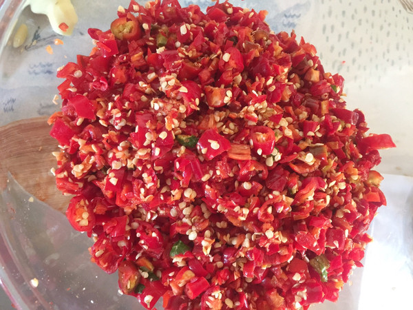把辣椒用到剁碎,也可用料理机打碎,我觉得还是手工剁的好吃所以纯手工剁的噢