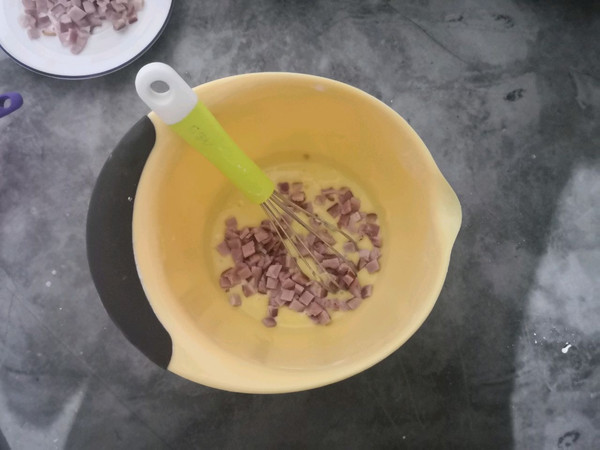 烘烤的时间我们可以做夹馅,把土豆泥,牛奶,盐,培根搅拌均匀即可。