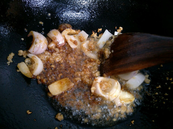 锅中放入油,切好的洋葱和蒜泥酱,翻炒。
