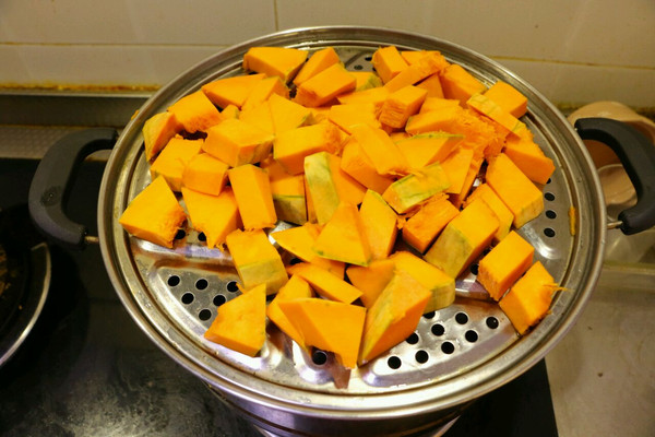 蒸熟后晾凉,料理机中入牛奶,再入南瓜块;