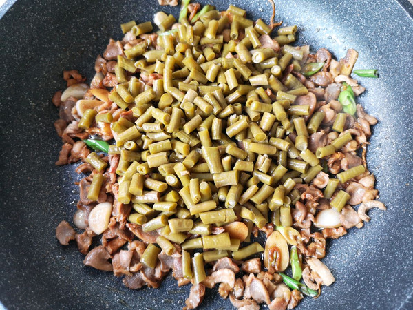 放入酸豆角大火快炒。