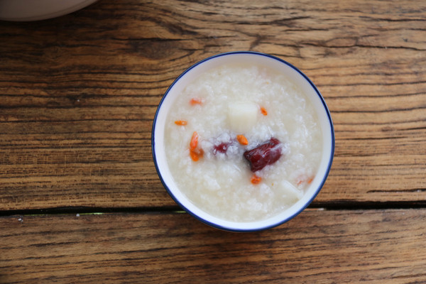 5、这时候米粥已经变得浓稠,放入冰糖和洗干净的枸杞,再煮10分钟,关火。