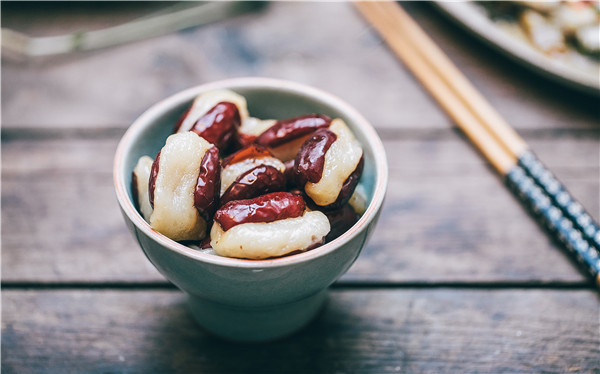 泡软的红枣剖开一边,去核;糯米面团分成6克的小剂子捏长条,塞入红枣。全部完成后放冰箱备用。