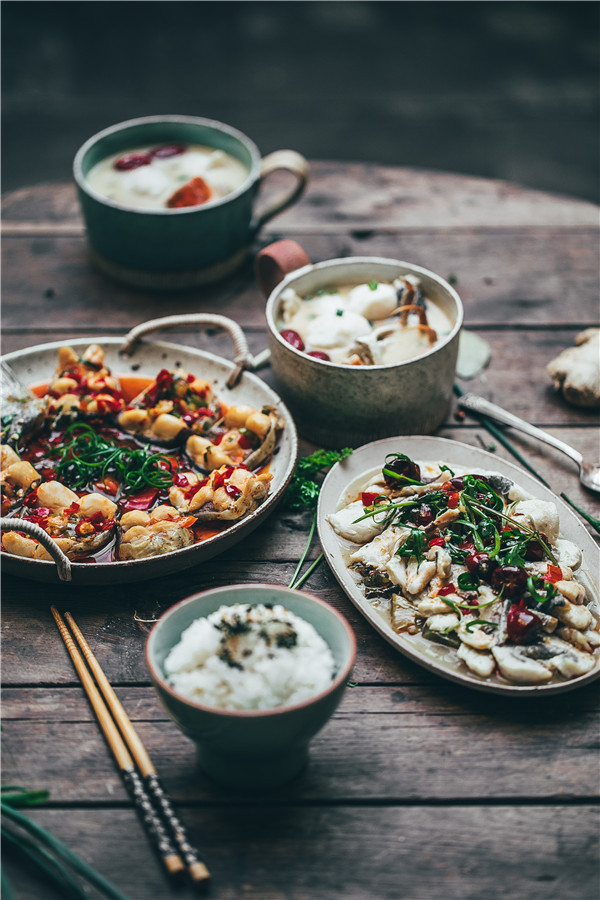 观察蒸格,当蒸汽萦绕的时候,将红枣糯米放在小碗中,置于底部蒸格;鱼划水放在中部蒸格;鱼片放在顶部蒸格。这一步动作需尽快,以避免蒸汽过多跑漏。观察面板,剩余时间约30分钟左右。