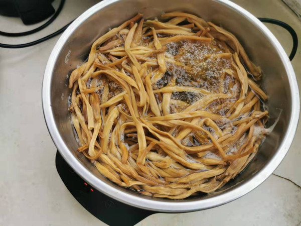 锅中加水烧至微沸,将黄花菜干投入锅中,盖盖焖15分钟。黄花菜干品泡发后,体积会因为吸足了水分,而膨大很多,因此在泡发黄花菜干时需要一次性加足水。