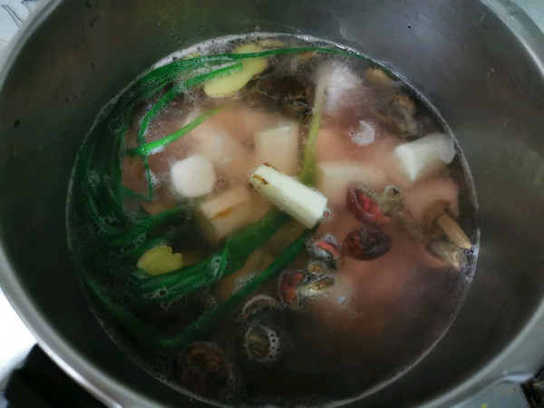 加小葱,老姜,料酒,盐,红菇,山药,大火上汽后盖阀转小火再20分钟