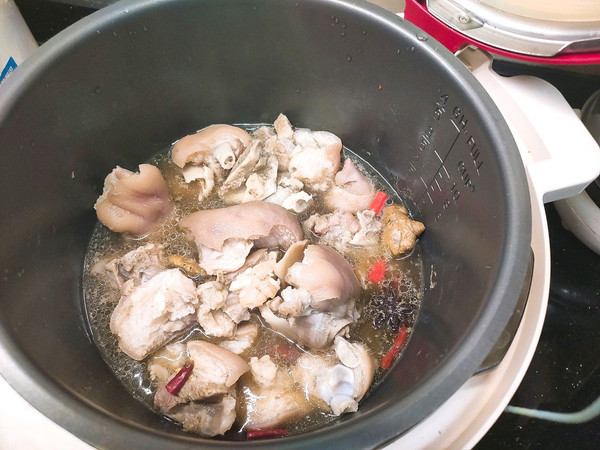 煮饭时间一到,马上关闭电源,并且在可以打开锅时马上打开,以免闷太久,导致猪手太烂没嚼劲,