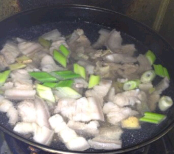 4锅中倒入适量清水,放入焯好的五花肉,放入葱段,姜片和料酒,大火烧开转中火煮十五分钟关火,冷凉一会,撇去浮油。