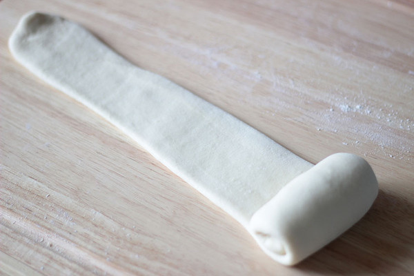 取一块面团,擀成牛舌状后卷起