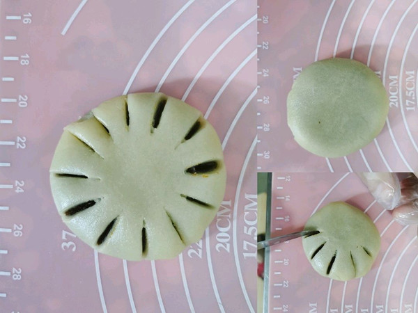 接口朝上压扁,擀成牛舌状,三折擀开,包入馅料,封口底朝下压扁。