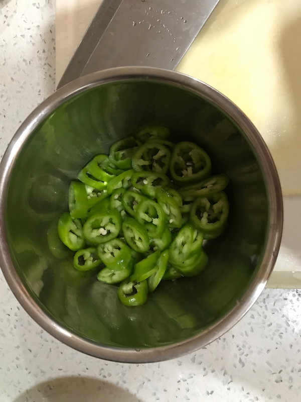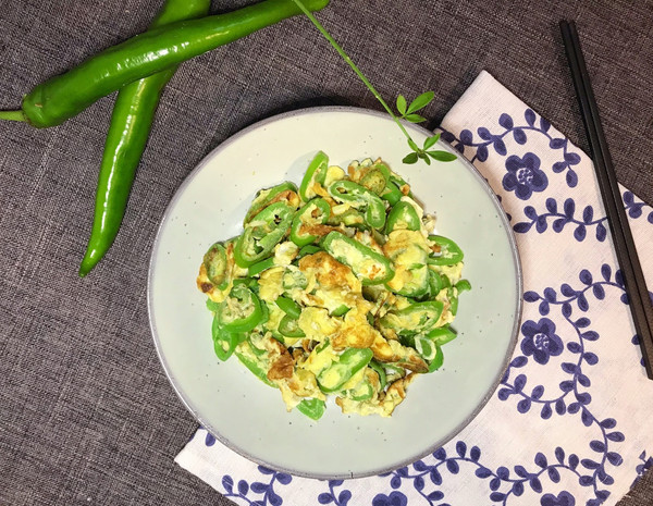 将盆里的辣椒鸡蛋全部倒入锅中 一面煎好开始翻炒 中小火就可以