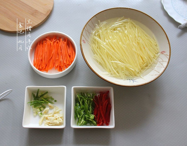 土豆去皮洗净切丝,冲洗干净淀粉,泡入水碗中。胡萝卜洗净去皮切丝,备用。红椒、绿尖椒洗净切丝,葱、蒜切碎备好。