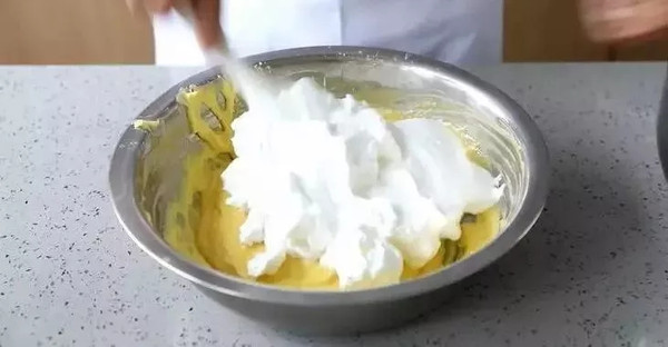 蛋清打发至一半时加入三分之一细糖,快打发完成时全部加入。