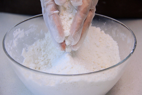 用较粗的筛网将搓散的粉类过筛,筛粉的过程会比较慢,要有一定耐心哈(可以用刮刀或者勺子以按压的手法来筛),过筛好的粉是松散的状态,一定不要再去按压,不然就白过筛了。