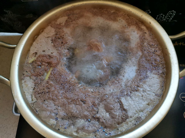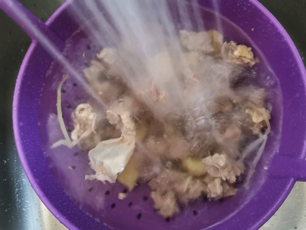 9出好血沫的牛肉连同葱姜一起捞出过冷水冲洗干净 沥好水 备用