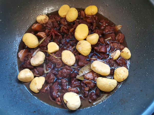 21闷炖好的牛肉如图样 汤汁变少 牛肉软烂 板栗软糯 就可以出锅了