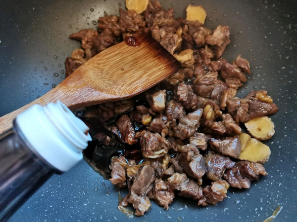 15当牛肉上色翻炒均后 倒入冰红葡萄酒