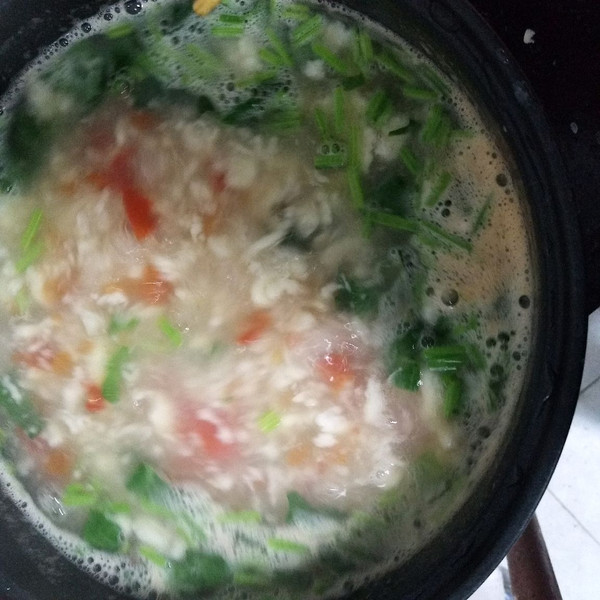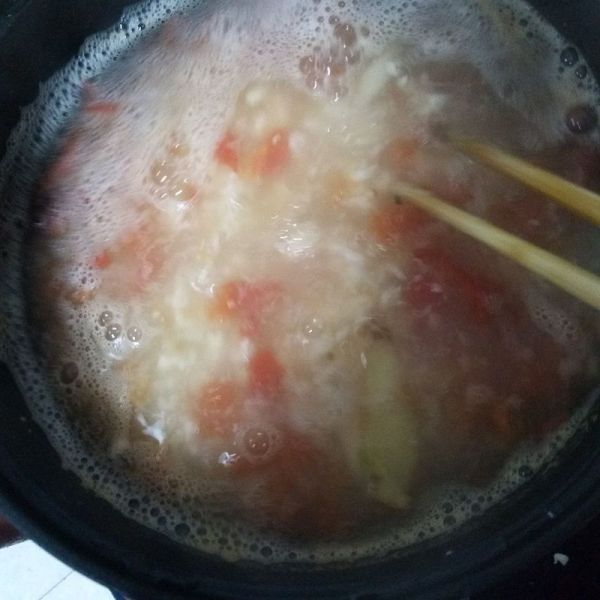 锅中烧水放入西红柿丁,姜片,葱节,盐,十三香 烧开