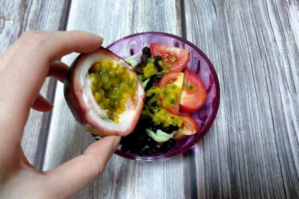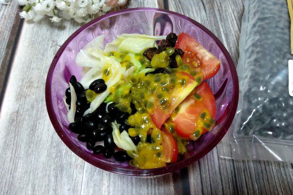 黑豆蒸熟后放凉备用,蕃茄切片,百香果切半。
