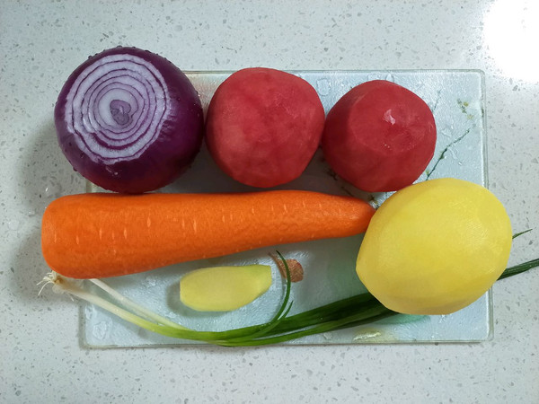 番茄、土豆、胡萝卜,炒到番茄出汁。