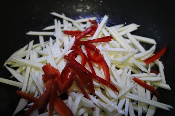 锅中留底油,倒入茭白和红椒丝翻炒。