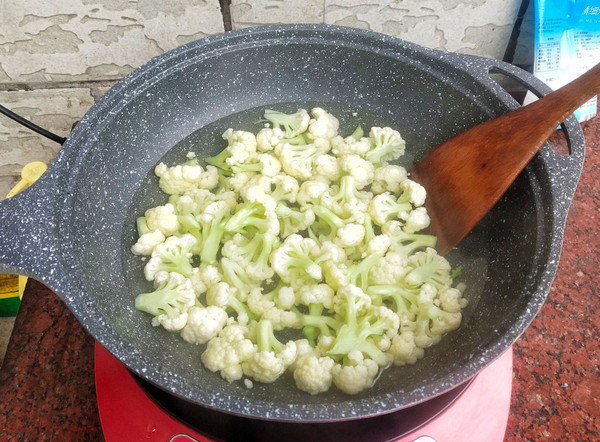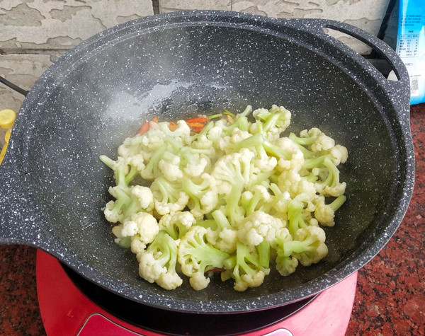 热锅凉油煸香葱白、蒜片、小米椒,接着倒入花菜,改大火翻炒均匀