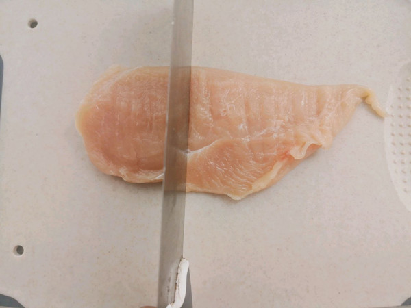鸡胸肉清洗干净,用厨房纸吸干水分,用刀横向一分为二,成为厚薄均匀的两片。切片是个技术活,多切几次就会了,俗话说“熟能生巧”。