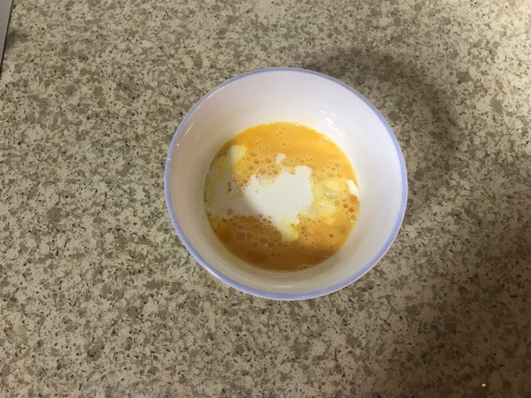 3个鸡蛋打散,加牛奶、淀粉、盐搅拌均匀。